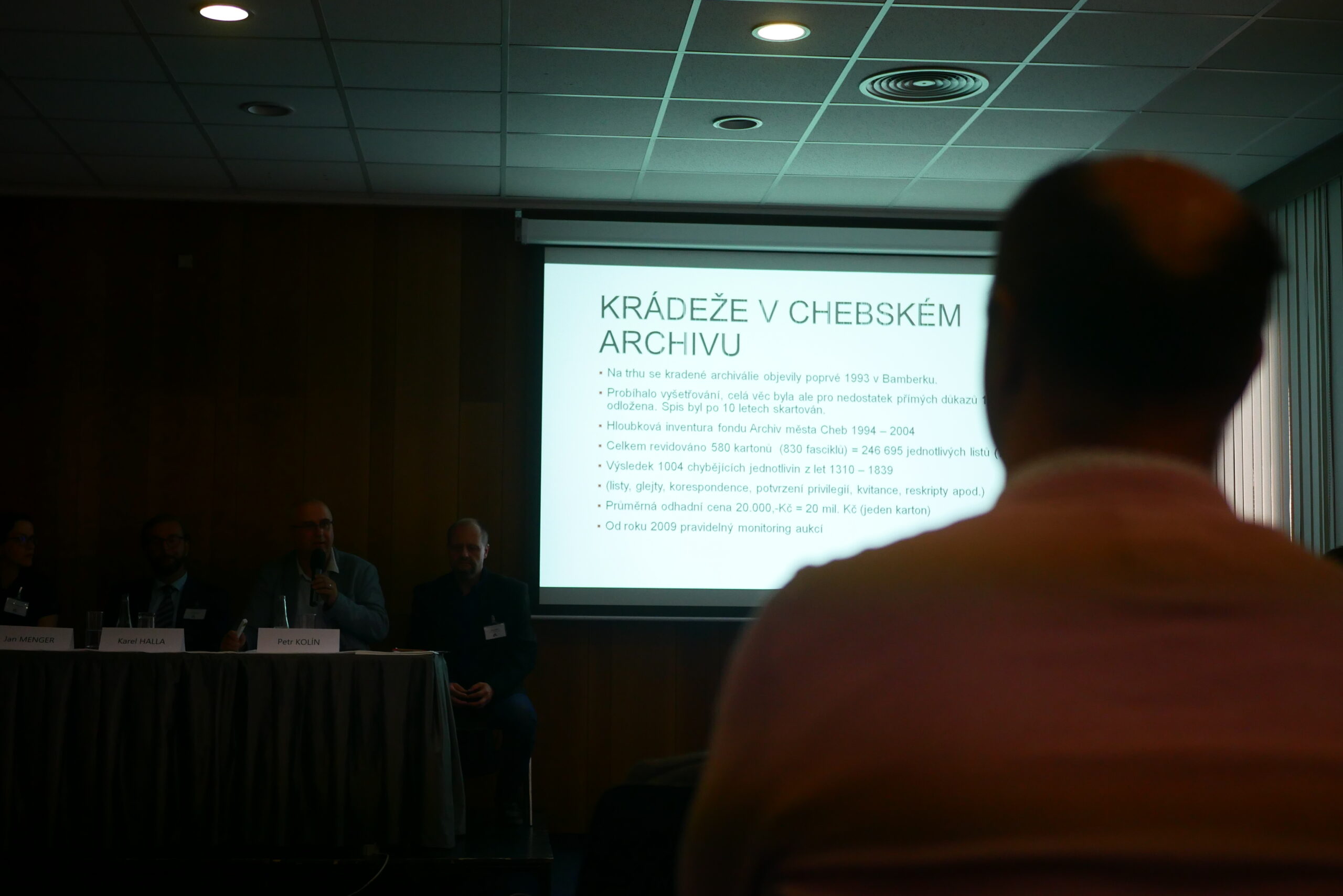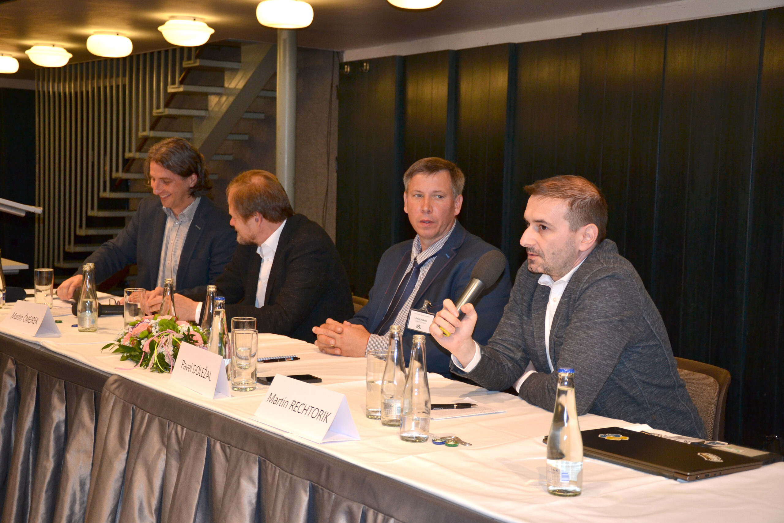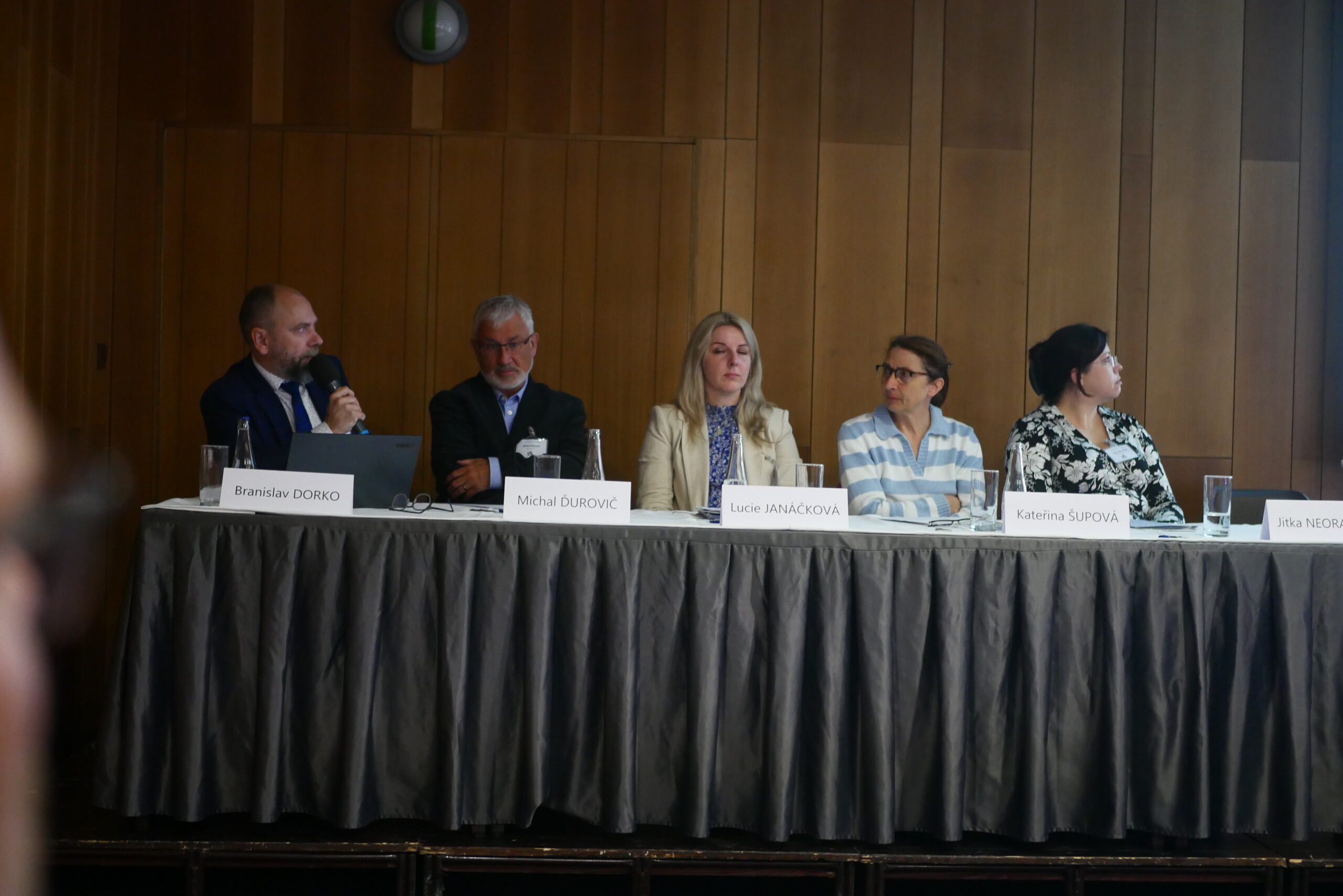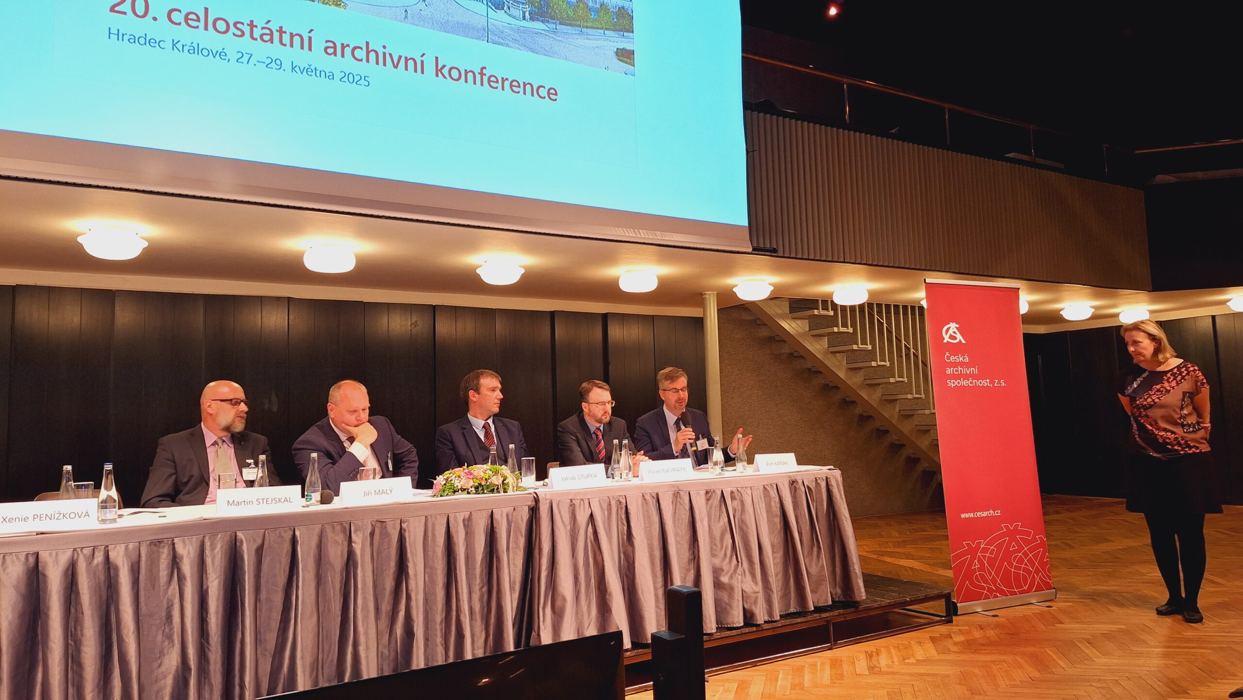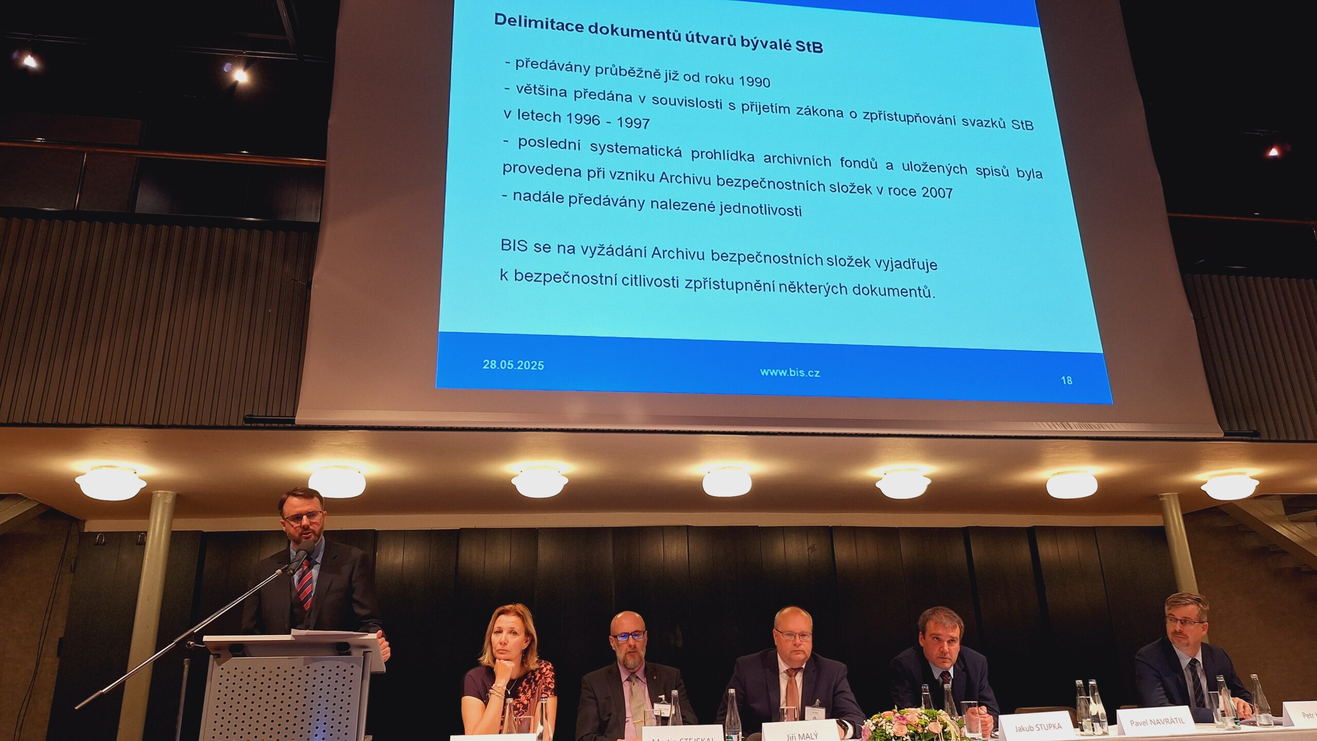 Zleva Martin Stejskal (Archiv Národního bezpečnostního úřadu), Jiří Malý (Národní bezpečnostní úřad), Jakub Stupka (Bezpečnostní informační služba), Petr Kaňák (Úřad pro zahraniční styky a informace), Pavel Navrátil (Bezpečnostní informační služba) a moderátorka této sekce Xenie Penížková (Archiv bezpečnostních složek)